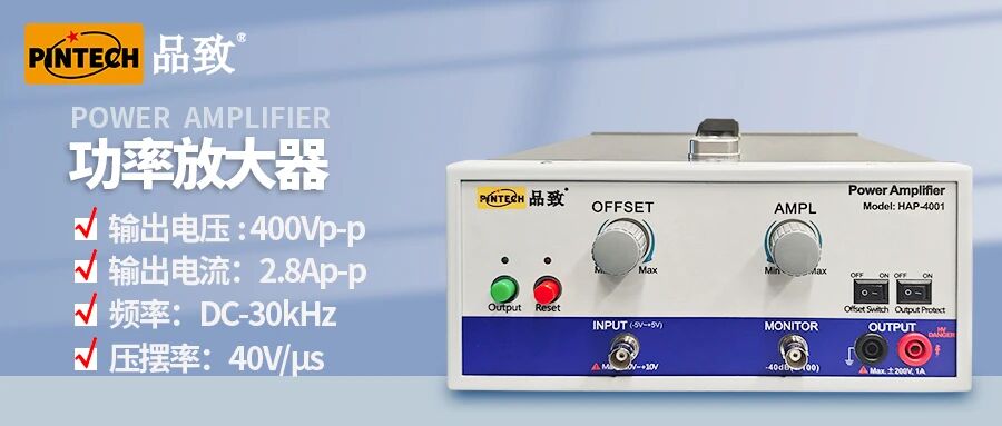 1、將高壓放大器設(shè)置為所需的增益(例如20倍)。將其輸入端連接到信號發(fā)生器的方波輸出。將放大器的輸出端連接到示波器的一個通道,并且應(yīng)使用高帶寬示波器和探頭,避免測量系統(tǒng)本身引入的誤差。